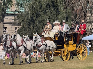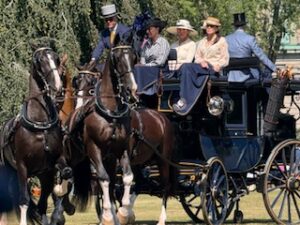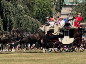 Last year, I spent another summer in Newport, Rhode Island and enjoyed a new adventure. Duby and I attended the “Golden Age of Coaching” driving exhibition of authentic 19th century coaches on the grounds in front of the Elms Mansion. The matched horses are magnificent and highly trained, the coaches opulent and the expert drivers are skilled at controlling their team of four horses using the “4 in one hand” reins technique.